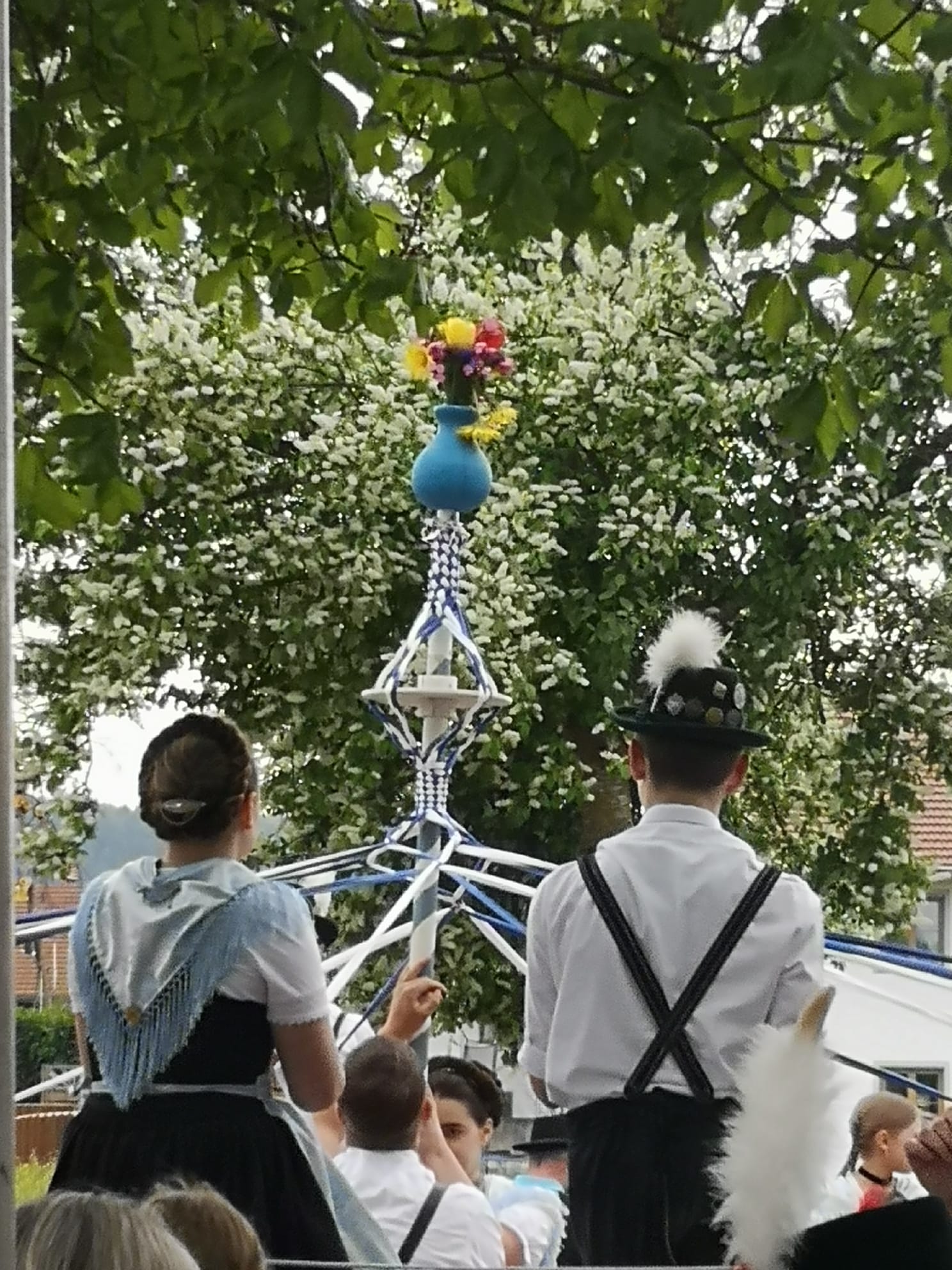 die Bänder beim Minimaibaum kunstvoll ineinandergeflochten und danach wieder aufgelöst.
